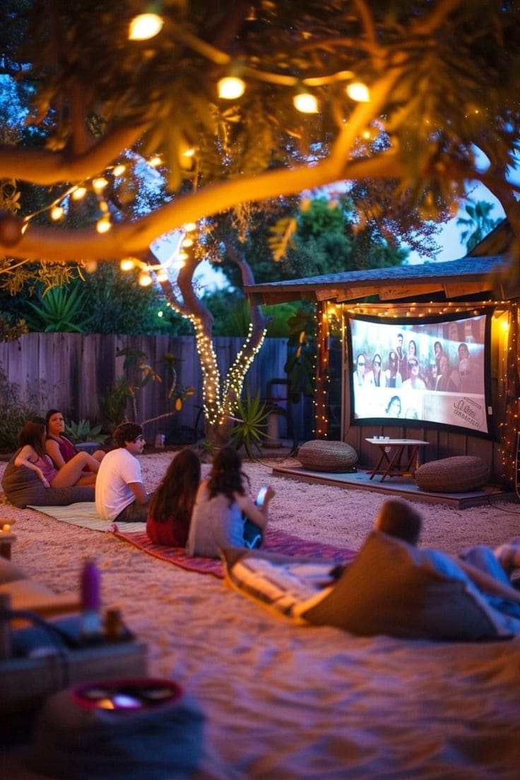 Every night becomes unforgettable with this enchanting backyard movie setup. Surrounded by glowing string lights and cozy seating on soft sand, this design transforms your outdoor space into a cinematic paradise.