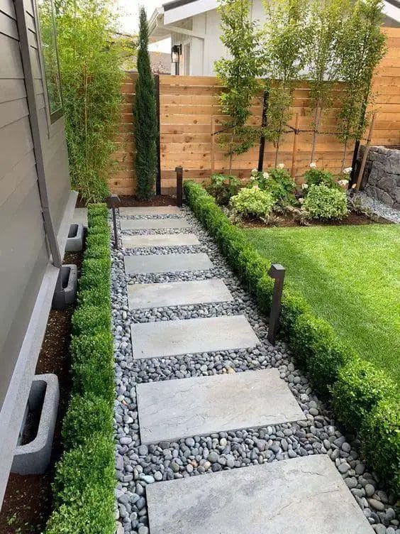 What about transforming your backyard with a sleek stone pathway framed by lush, manicured hedges? This design pairs clean lines with natural textures, creating a polished yet inviting walkway.