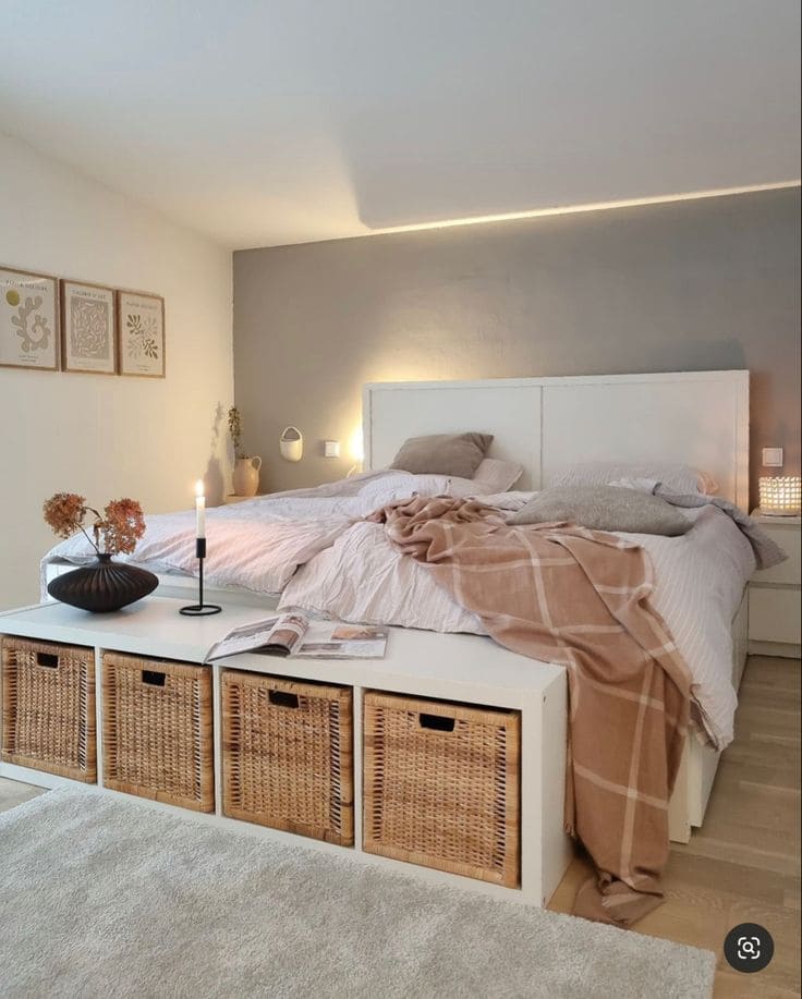The built-in under-bed compartments with woven baskets bring warmth and practicality, making it easy to store essentials while keeping a rustic charm.