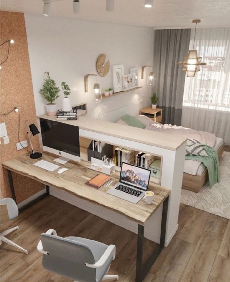 The combination of a sleek workspace and a cozy sleeping area creates the perfect balance between work and relaxation.