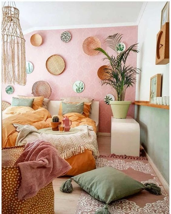 You can transform your bedroom into a dreamy oasis with this charming pink Bohemian design.