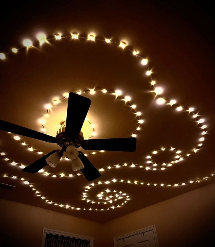 At night, this ceiling becomes a dreamy constellation with light strands spiraling like galaxies around a humble ceiling fan. It brings a magical calm to bedrooms or quiet corners, softly twinkling above with hypnotic beauty.