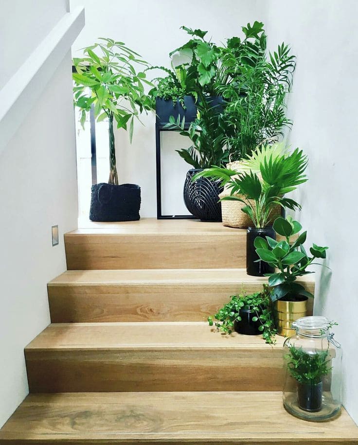 Each step of your staircase becomes a canvas for creativity with this stunning plant display. A variety of lush greenery, from towering palms to delicate ferns, is artfully arranged on each stair.
