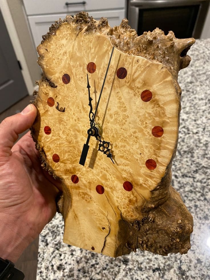 You can craft this elegant burl wood clock to elevate your decor with its natural charm. Highlighting the wood’s unique grain and smooth finish, the clock blends art with function.