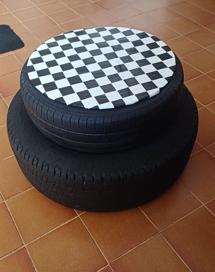 Inspired by the art of creative recycling, this checkerboard-patterned coffee table breathes new life into old tires.