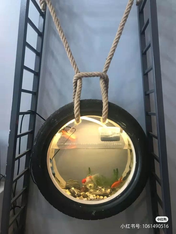 Do you want a stunning centerpiece that merges creativity and tranquility? This hanging tire aquarium is a masterpiece! Suspended with rustic ropes, it houses a lively aquatic world within an upcycled tire.
